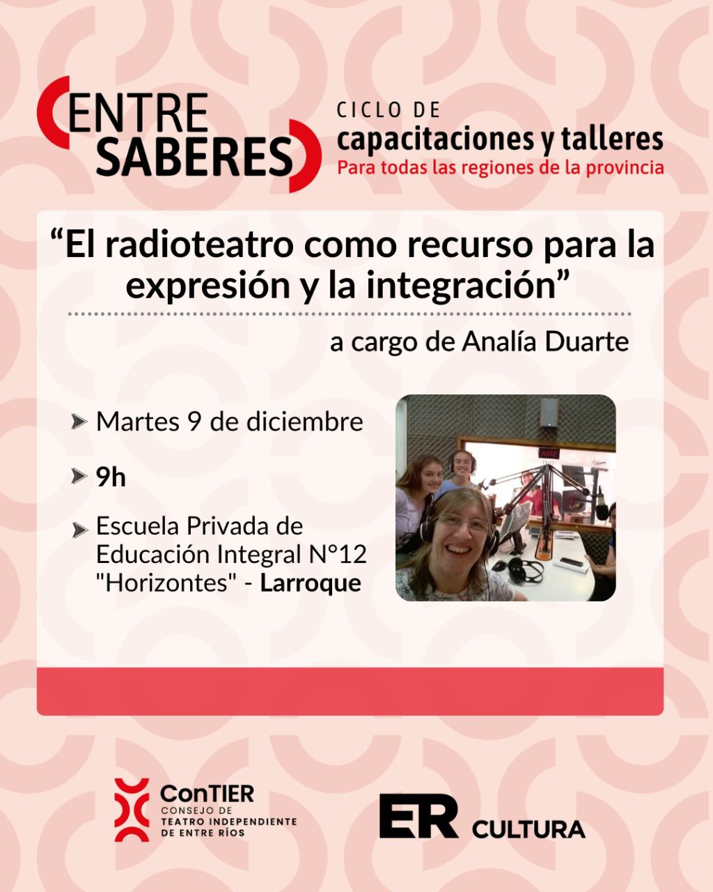 *En Larroque,en el marco del Ciclo de capacitaciones y talleres se brindará un importante encuentro libre y gratuito bajo el lema «El Radioteatro como recurso de la expresión y la integración». El ciclo fue ideado para distintos lugares de la Pcia. de E.R. y cuenta con el respaldo del Concejo de Teatro Independiente de Entre Ríos (ConTier) y Cultura de la Pcia.