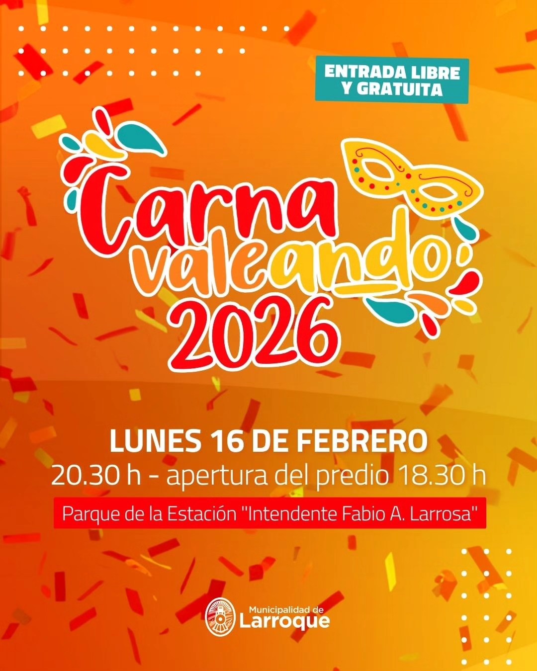 *La Municipalidad de Larroque a través del Área de Cultura, ultima detalles organizativos para la gran fiesta que tendrá lugar el lunes 16 de febrero en el parque de la Estación “Intendente Fabio A. Larrosa”.