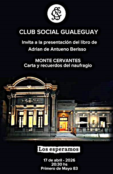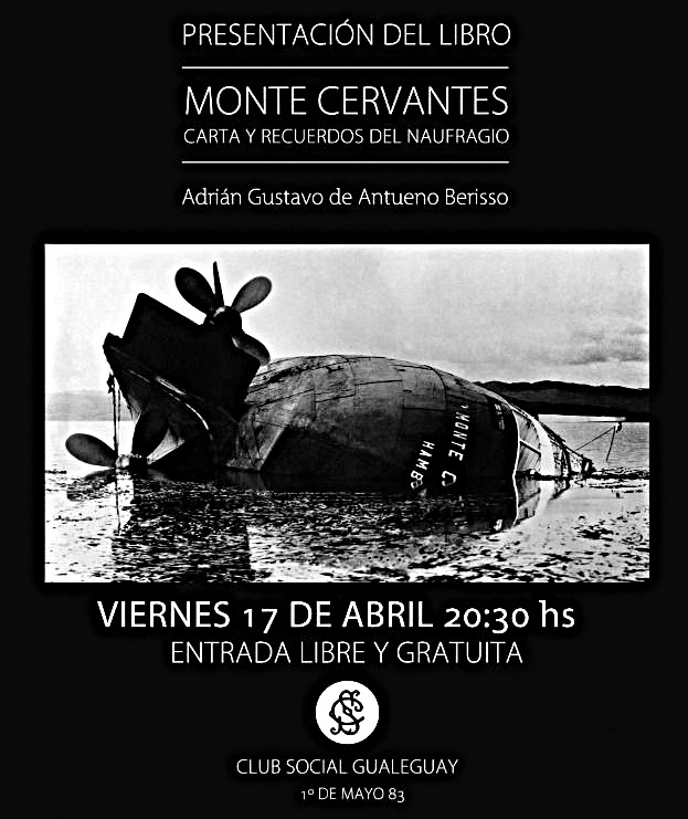 «Monte Cervantes cartas y recuerdos del naufragio» – *Adrián de Antueno presentará un nuevo destado Libro -una historia olvidada- de su autoría en el club Social la ciudad de Gualeguay, su terruño, . La entrada es libre y cabe destacar que el gualeyo A. Antueno es médico Veterinario, historiador, escritor, ex legislador y desde hace años junto a su familia vive en Usuhaia la ciudad más austral del país.