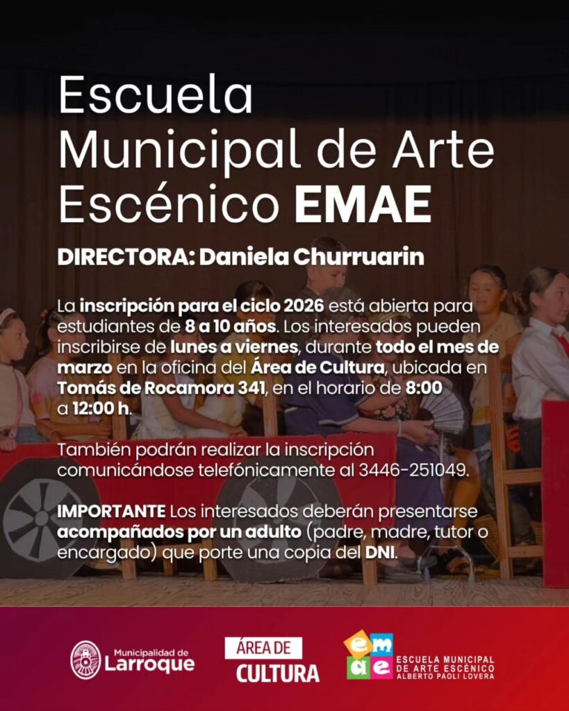 *La Municipalidad de Larroque, a través del Área de Cultura, informa que durante todo el mes de marzo se encuentra abierta la inscripción para el ciclo 2026. Está dirigido a niños y niñas de entre 8 y 10 años.