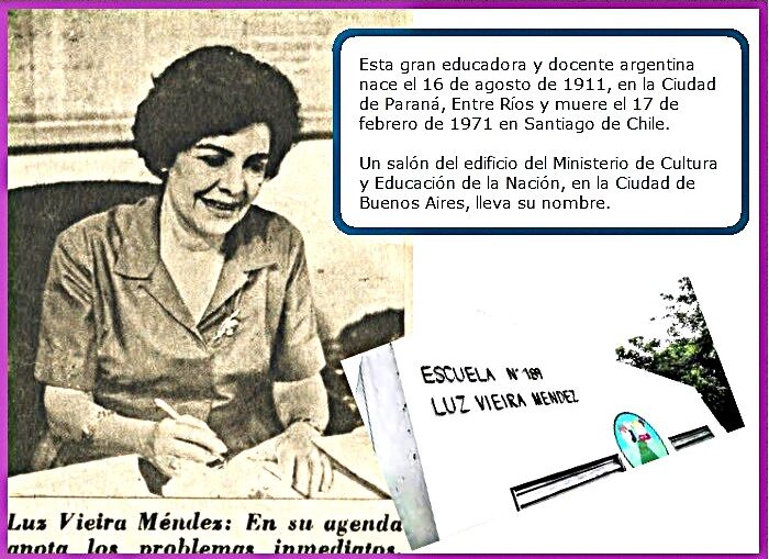 *1971 – Muere en Santiago de CHILE, la EDUCADORA Entrerriana LUZ VIEIRA MÉNDEZ. La Educadora, fue Presidenta del Consejo Nacional de Educación. Había nacido en PARANÁ E.R. Entre Ríos, el 16 de agosto de 1911.*