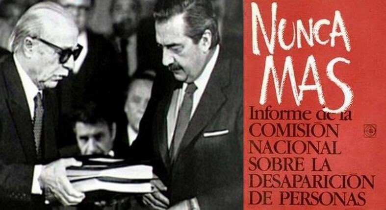 *1984 – La COMISIÓN NACIONAL SOBRE LA DESAPARICIÓN DE PERSONAS(CONADEP) entrega al Presidente RÁUL ALFONSÍN el INFORME que tras nueve meses de Investigación, documentaba la Existencia de 340 centros clandestinos de detención y 8.961 casos de desapariciones. El informe se conoce con el nombre NUNCA MÁS*.
