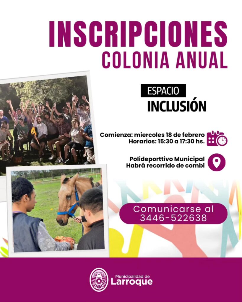 La Municipalidad de Larroque, a través del Área de Inclusión, informa que se encuentran abiertas las inscripciones para la Colonia Anual de Discapacidad.