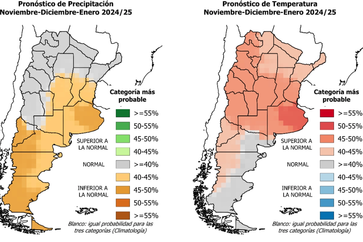 El informe al que tuvo acceso Elonce se indica que «el pronóstico de consenso para noviembre-diciembre-enero», en cuanto a temperaturas estima mayor probabilidad de ocurrencia de temperaturas medias superiores a las normales sobre toda la franja central del país (incluida Entre Ríos) y región del NOA con mayores chances hacia el este de Buenos Aires.