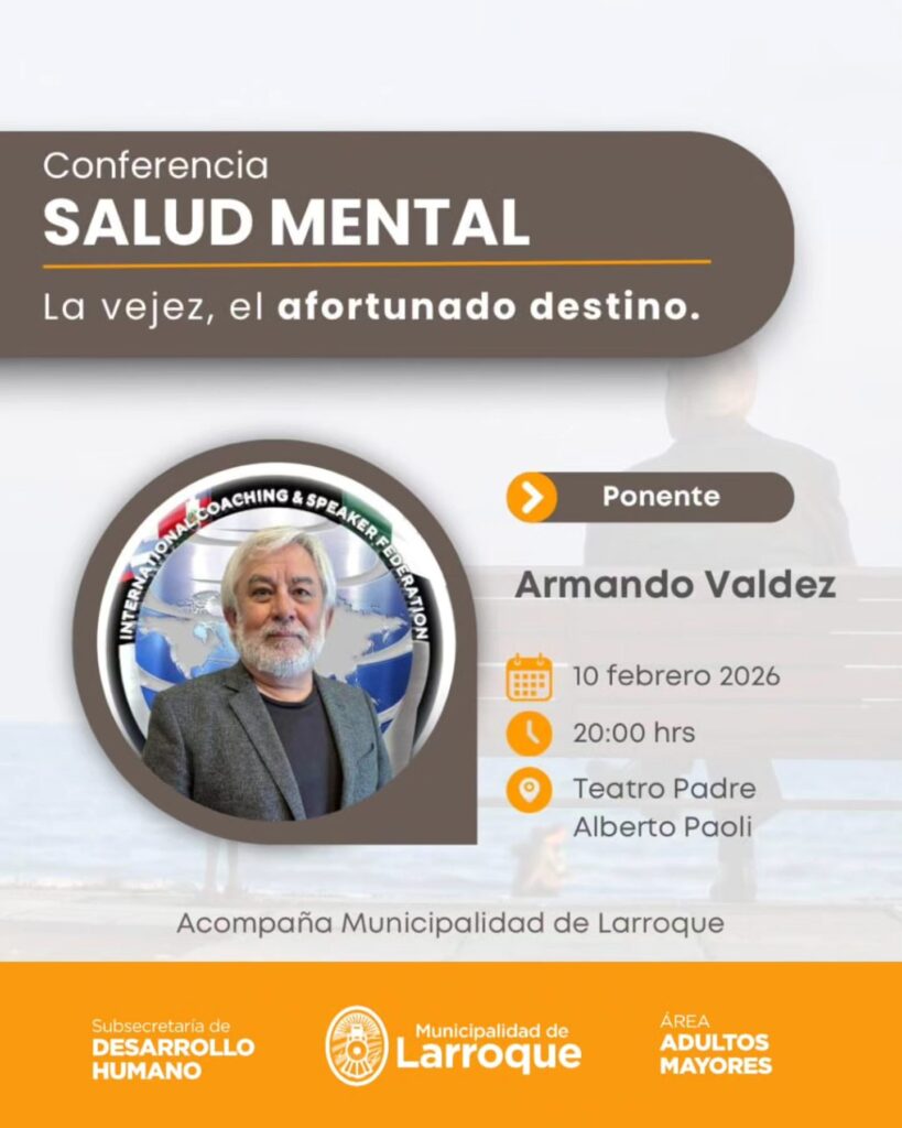 *La Municipalidad de Larroque, a través de la Subsecretaría de Desarrollo Humano y el Área de Adultos Mayores, invita a la comunidad a participar de la conferencia “Salud Mental: La vejez, el afortunado destino”, a cargo de Armando Valdez Rodríguez, Máster Speaker Internacional e integrante de la International Coaching & Speaker Federation.
